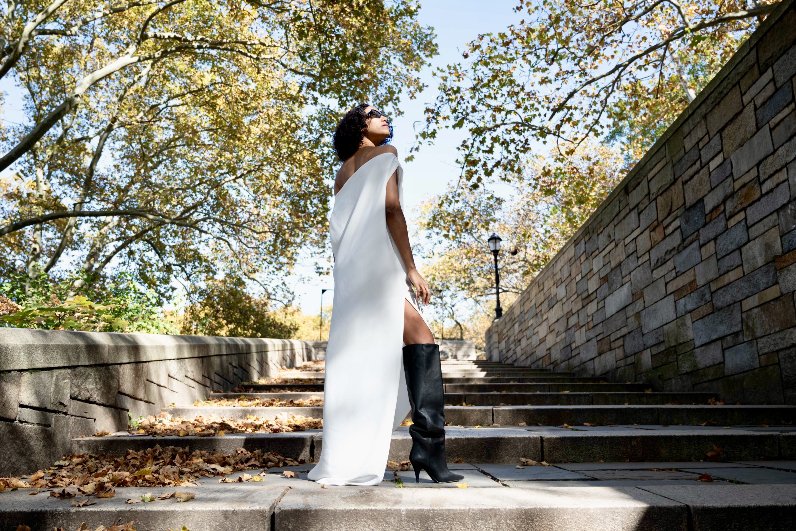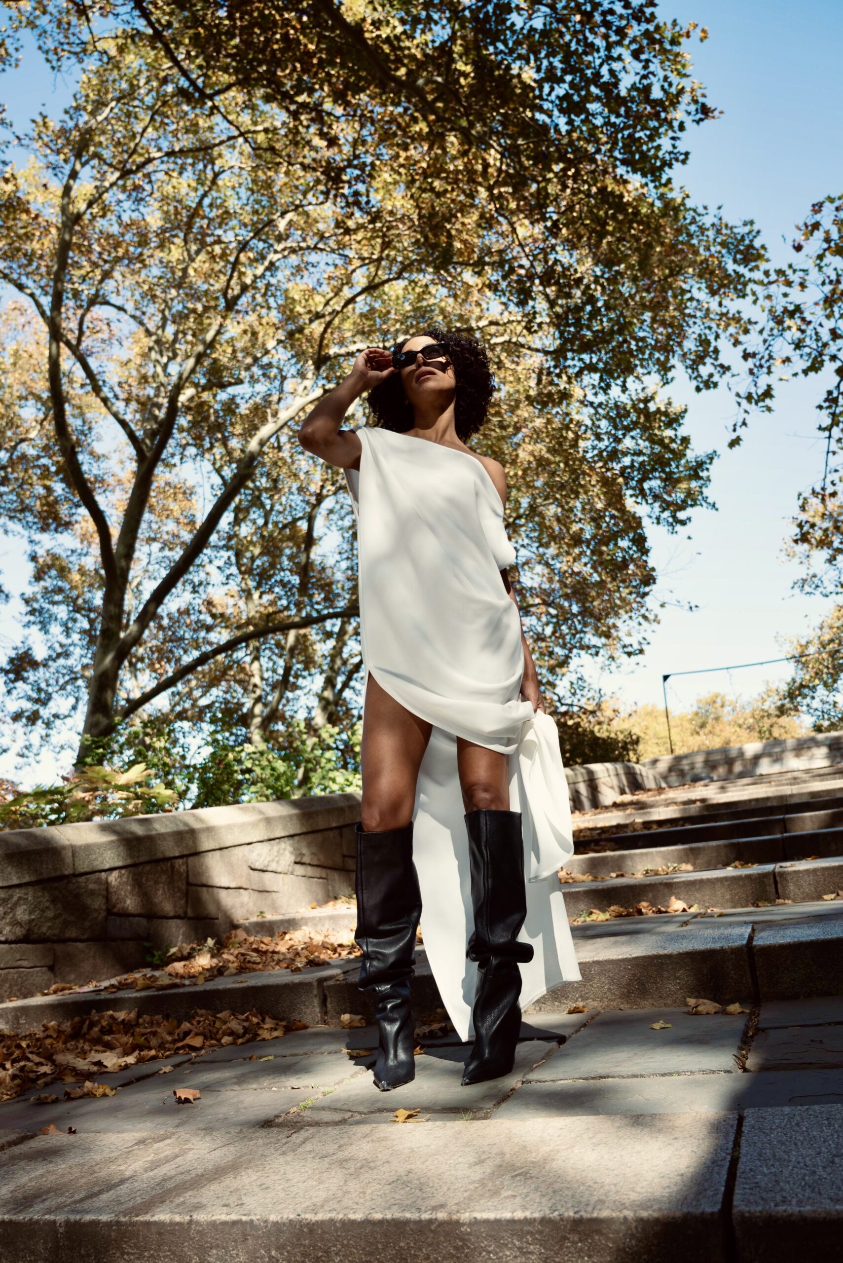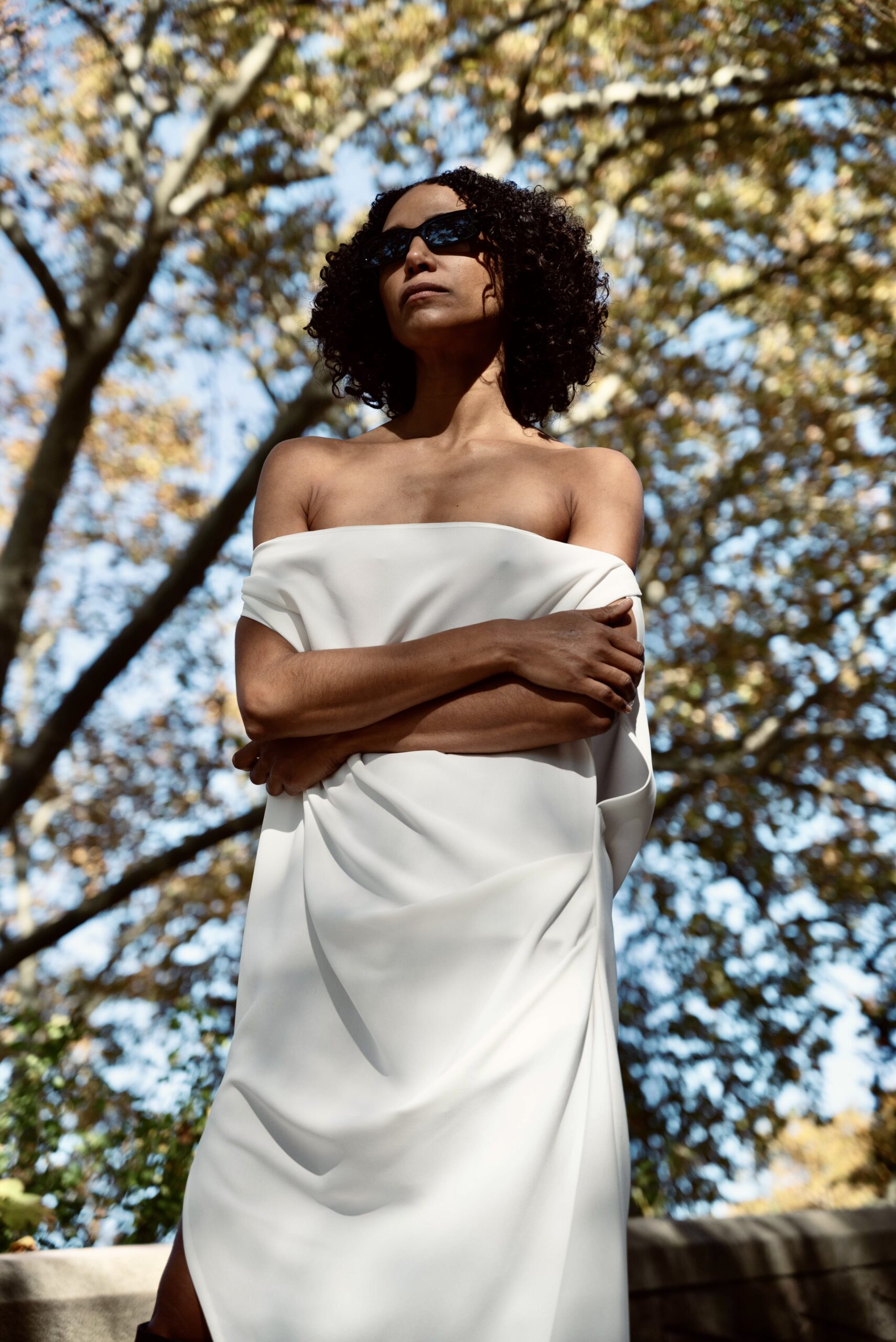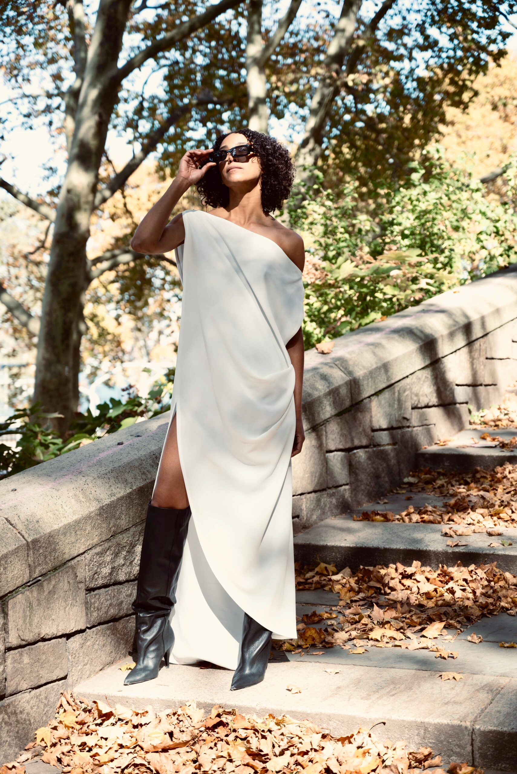 Very contemporary draped greek style dress in silk crepe, with side slit and draping on the side. Easy to wear and match.