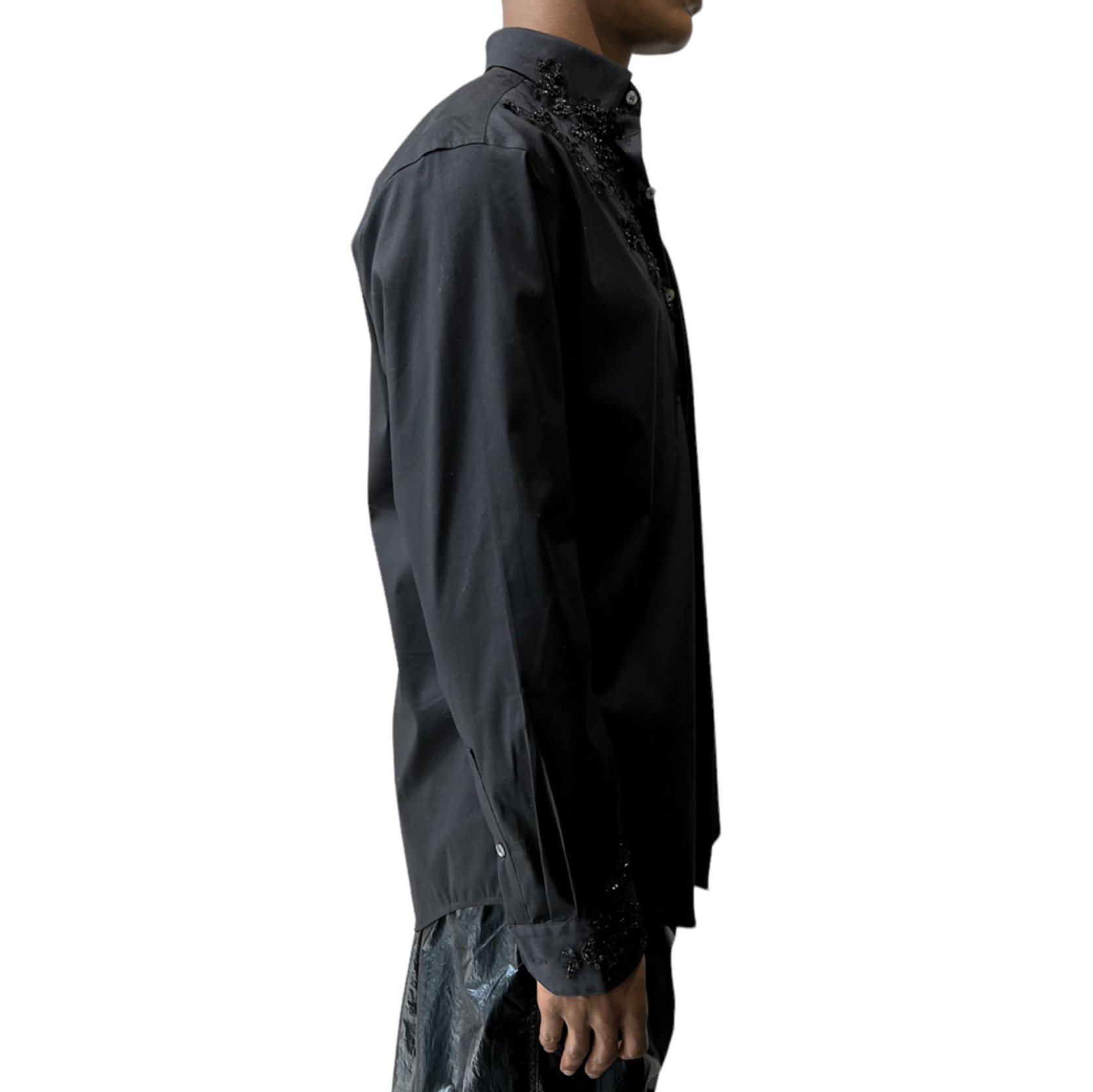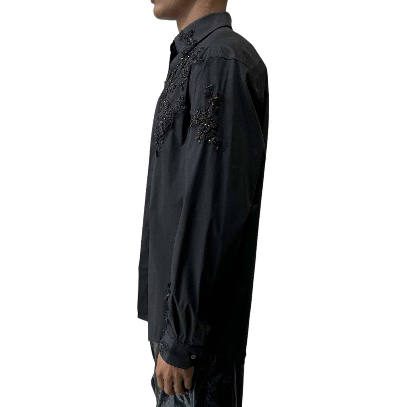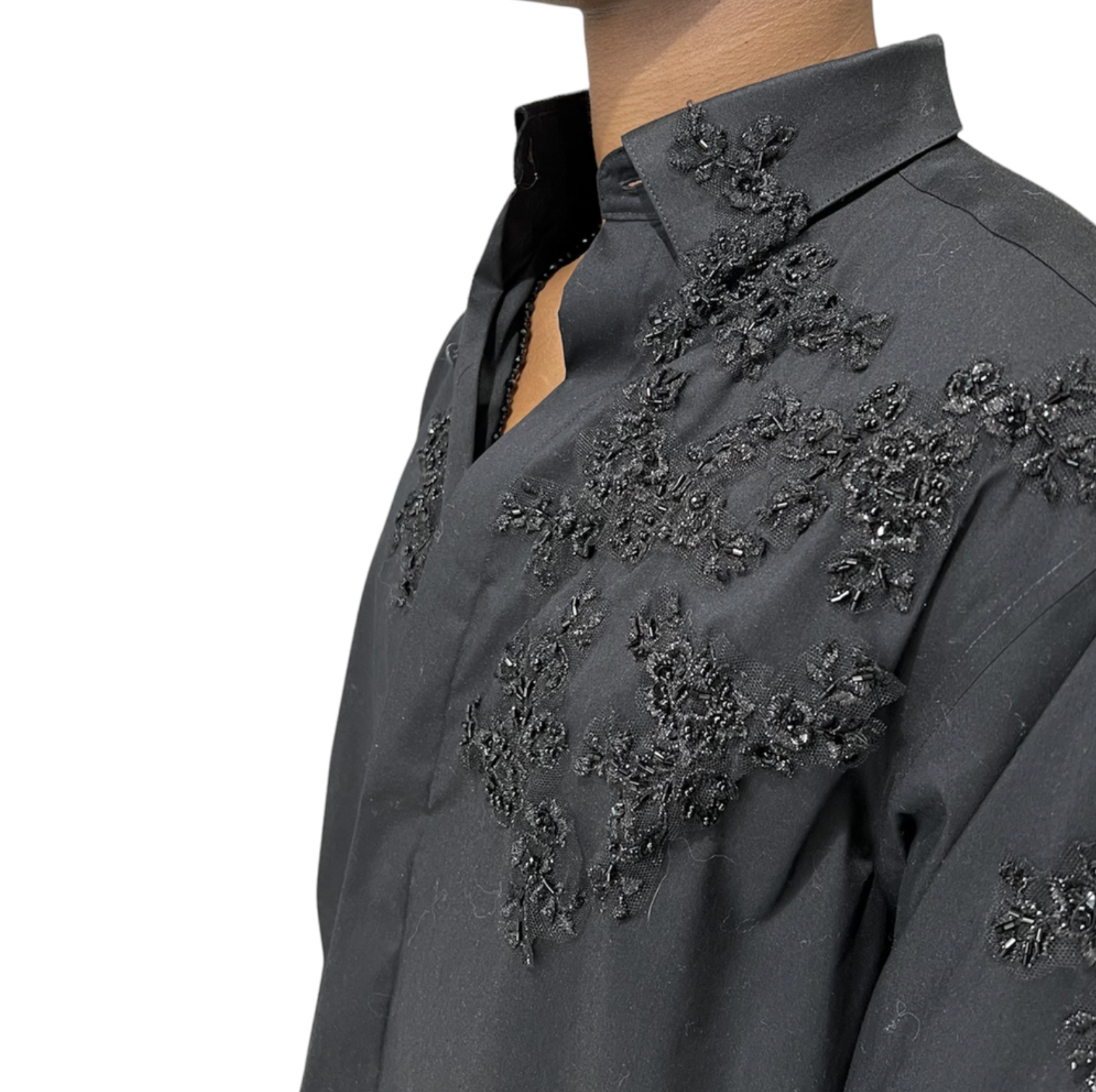 Regular fit cotton black shirt with hand-sewn embroidery.