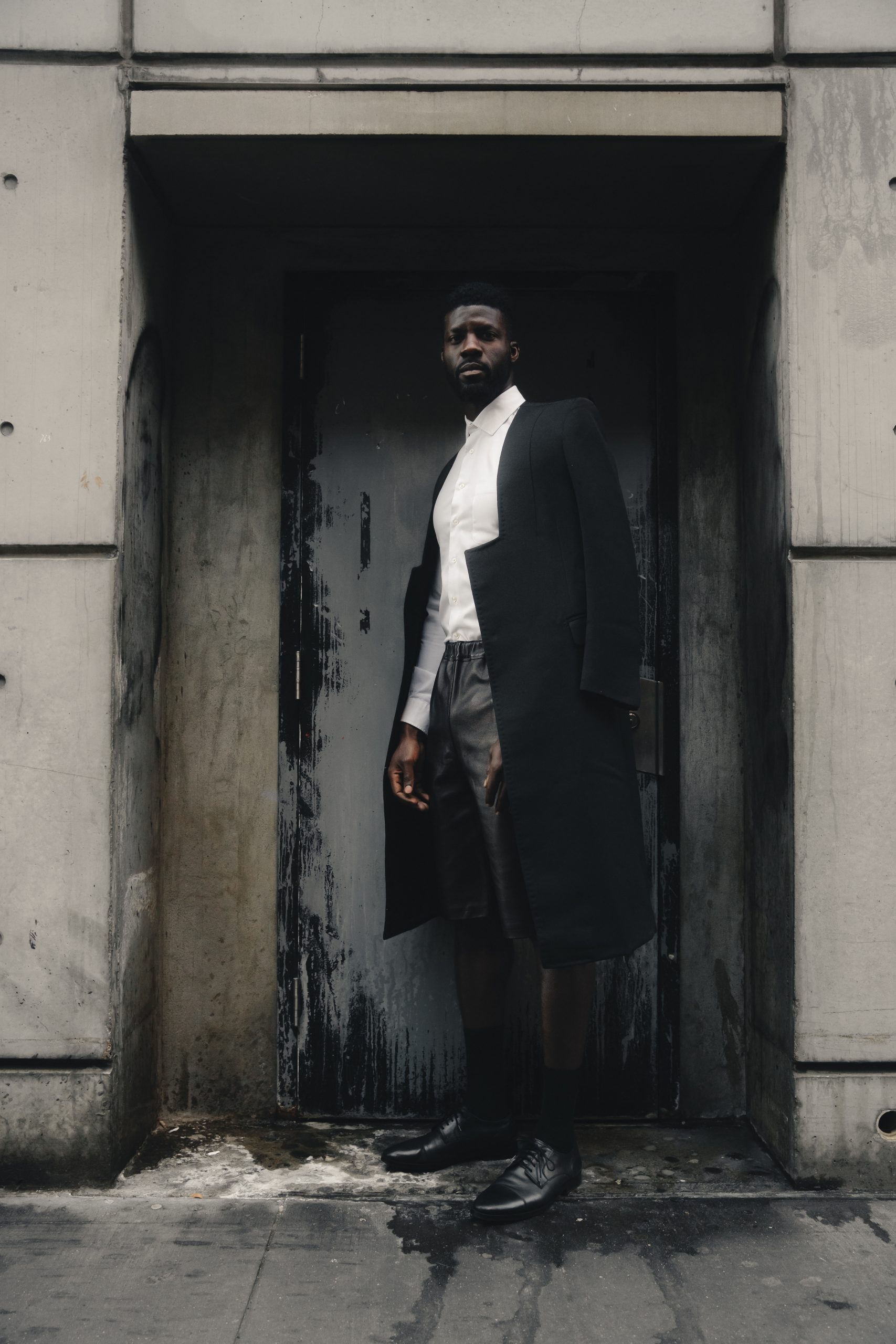 Black double-breasted coat in wool with flap pockets, button closures and back vent.