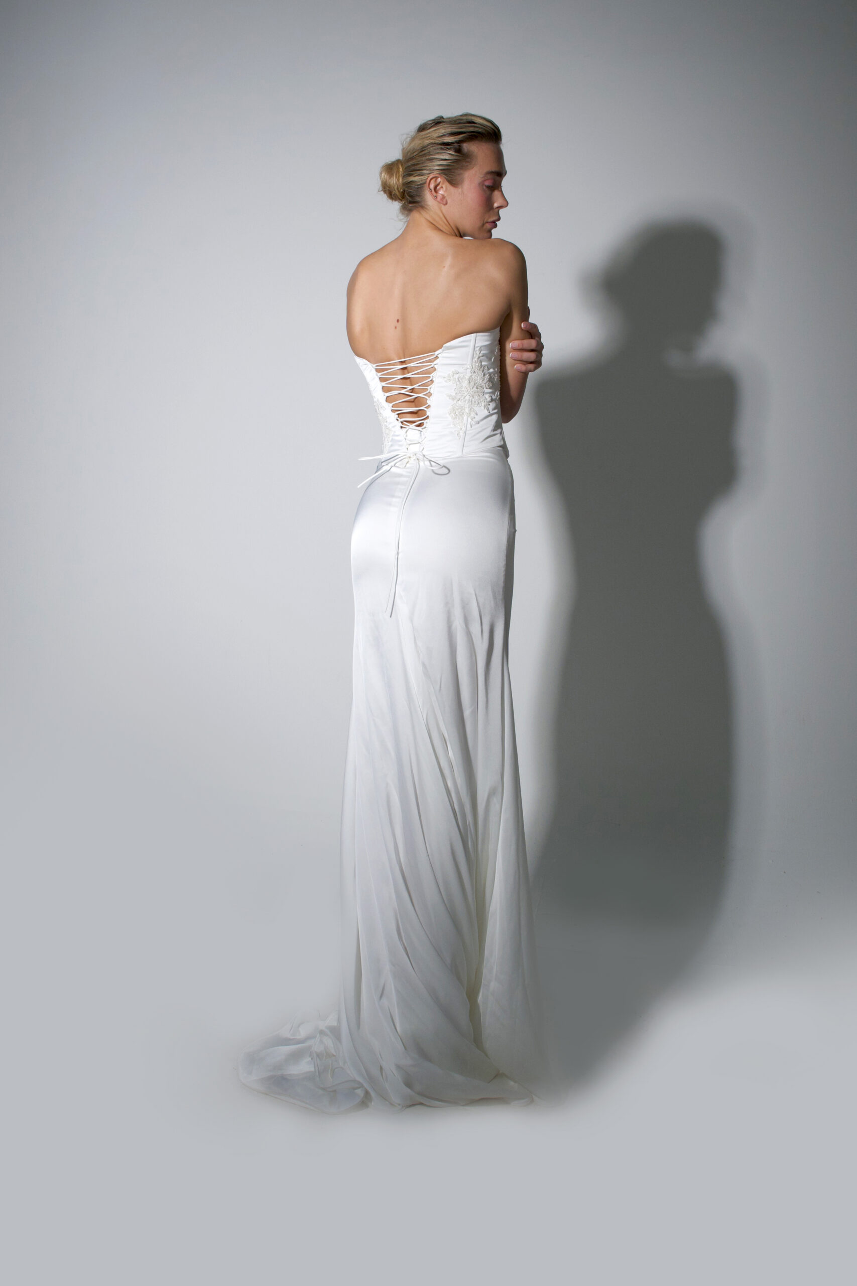 by hand. Closure with lace at the back. Soft skirt with an off-white satin train.