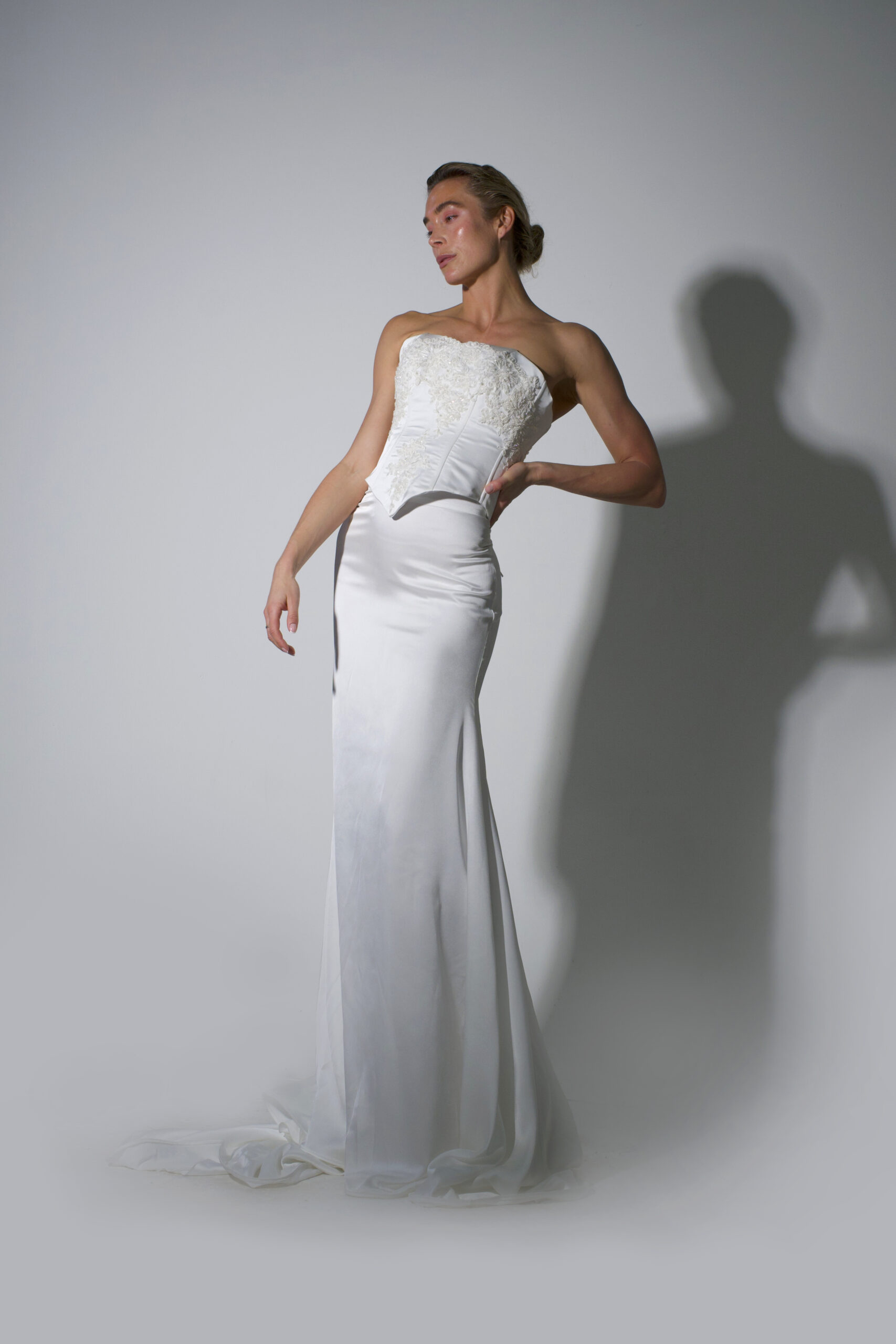 Timeless satin bustier embellished with floral embroidery meticulously sewn