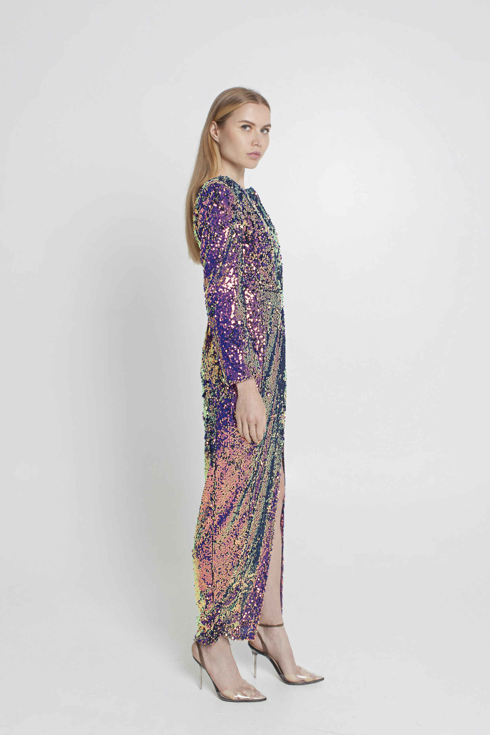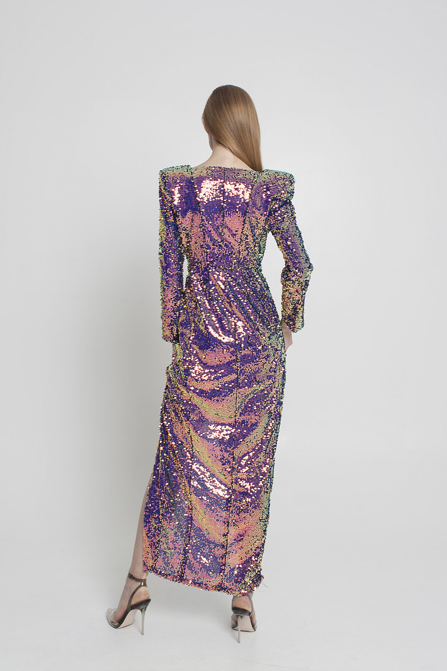 FUNKY IRIDESCENT SEQUIN DEEP V-NECK, LONG-SLEEVED JACKET/LONG DRESS WITH RIGHT SIDE HIGH SLIT AND SNAP BUTTON CLOSURES.