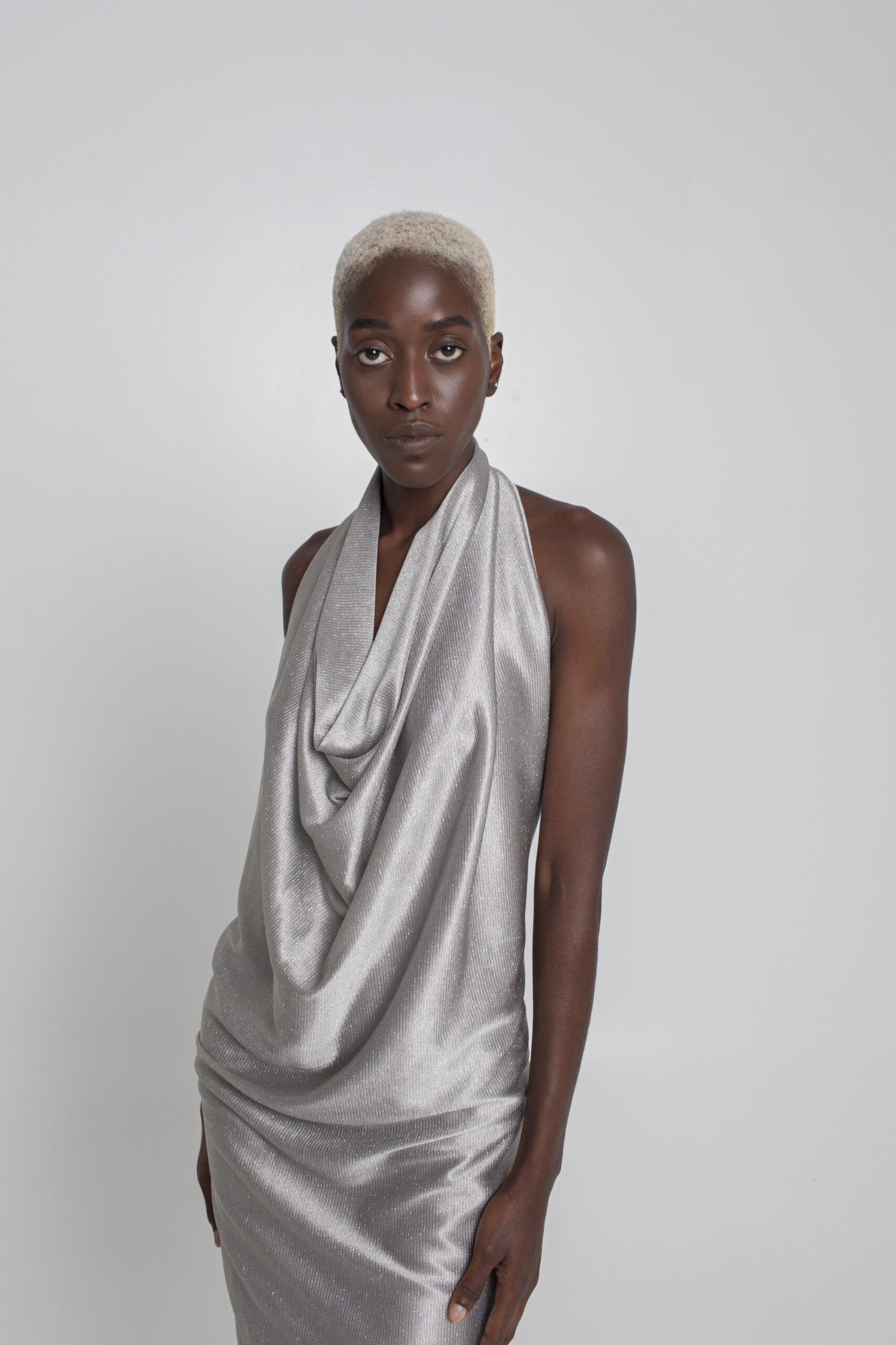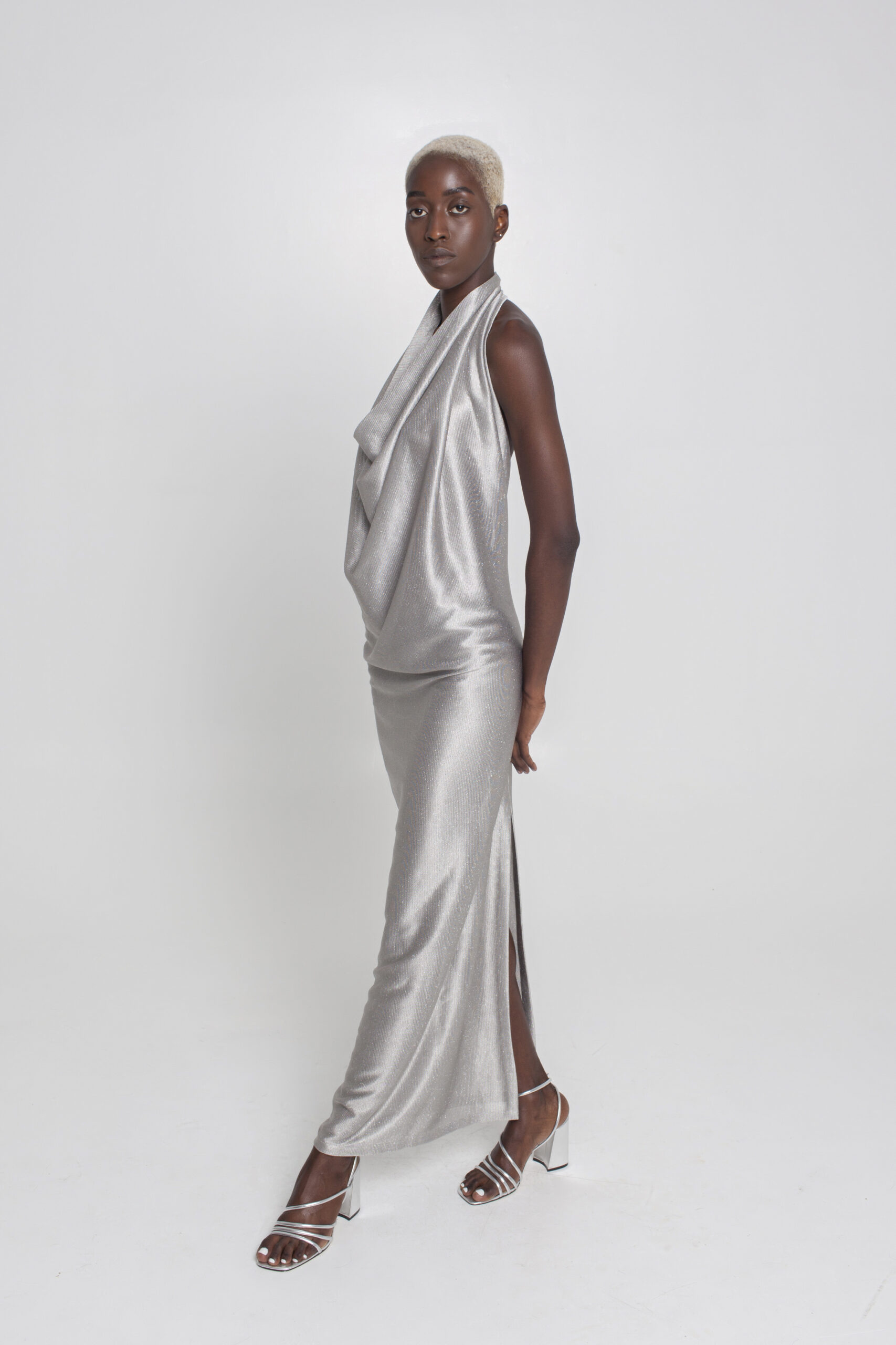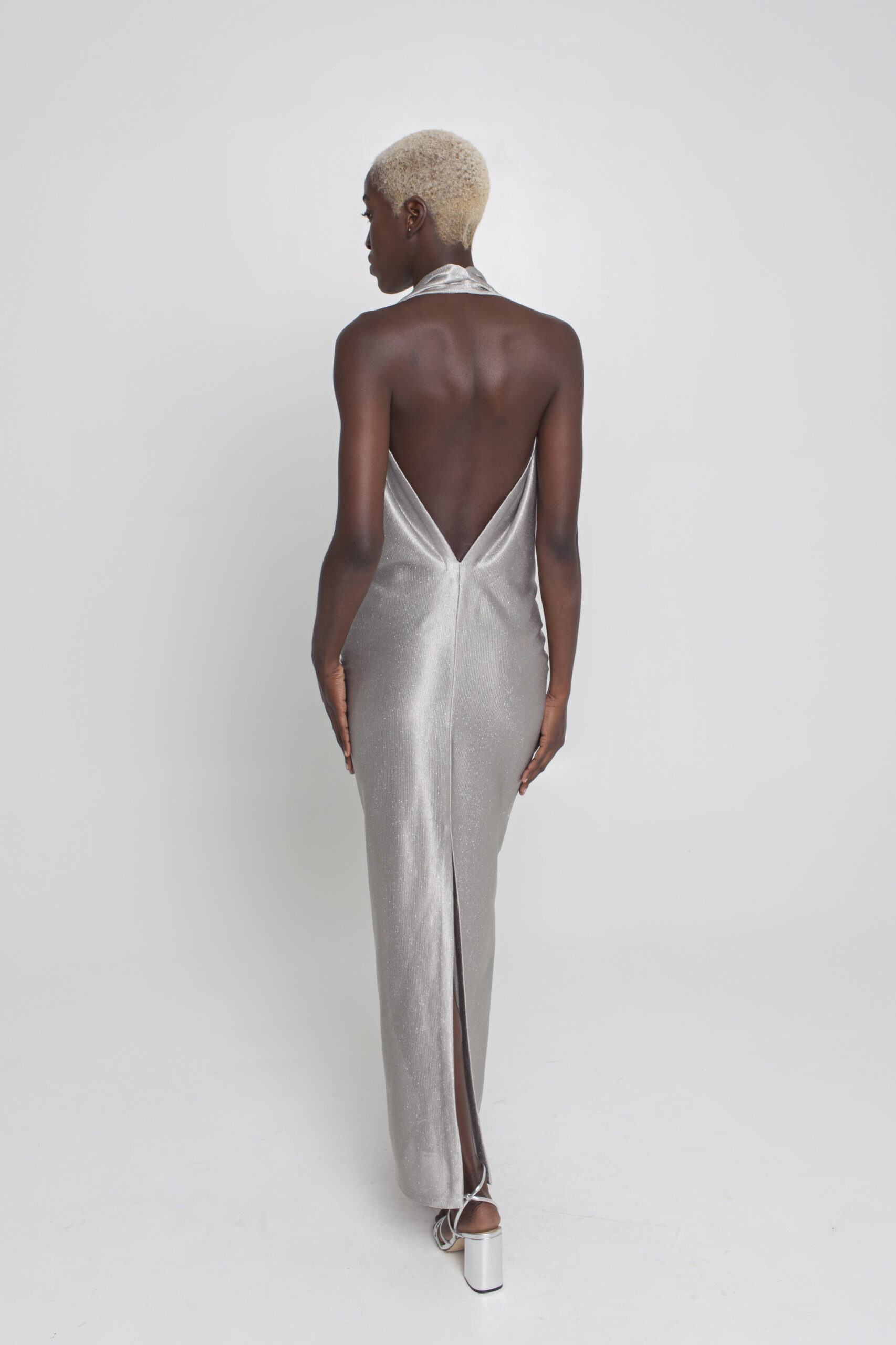 SILVER VISCOSE KNIT LONG DRESS WITH DRAPED HALTER NECK, OPEN BACK, AND CENTER BACK SLIT.