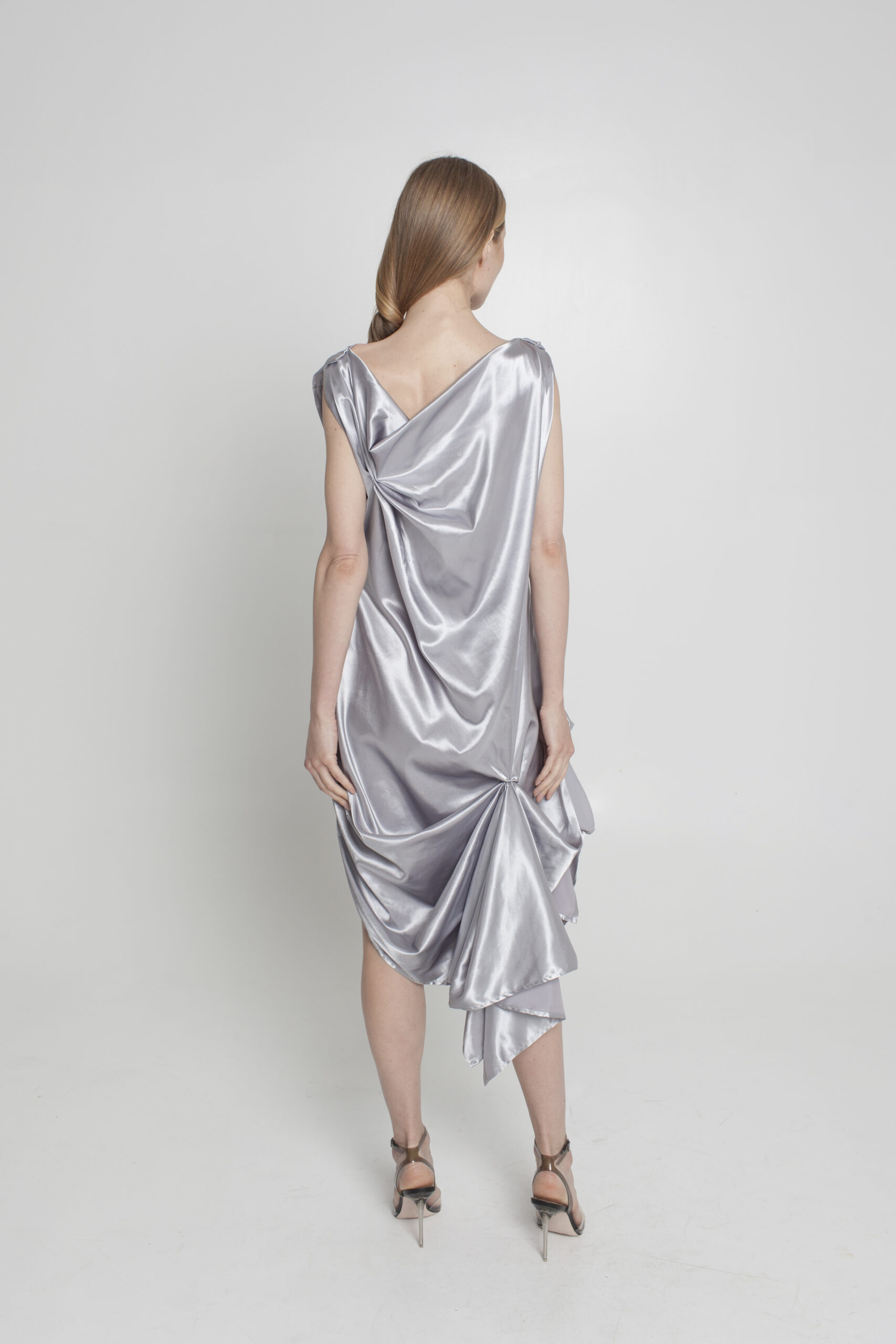 SILVER SILK SATIN DRAPED MIDI DRESS