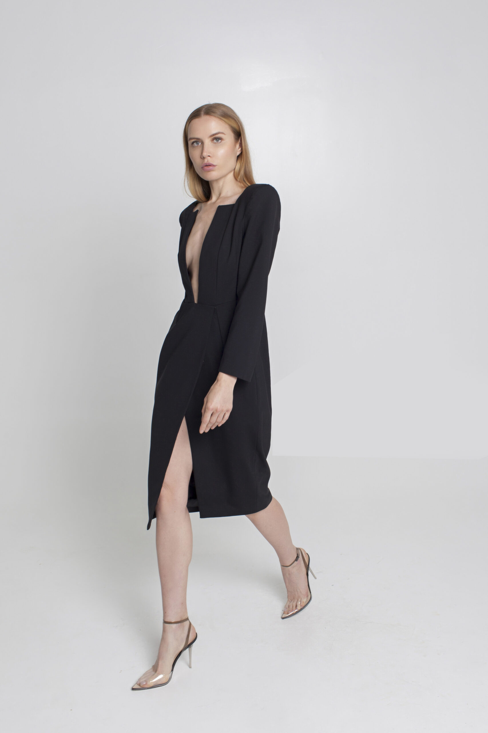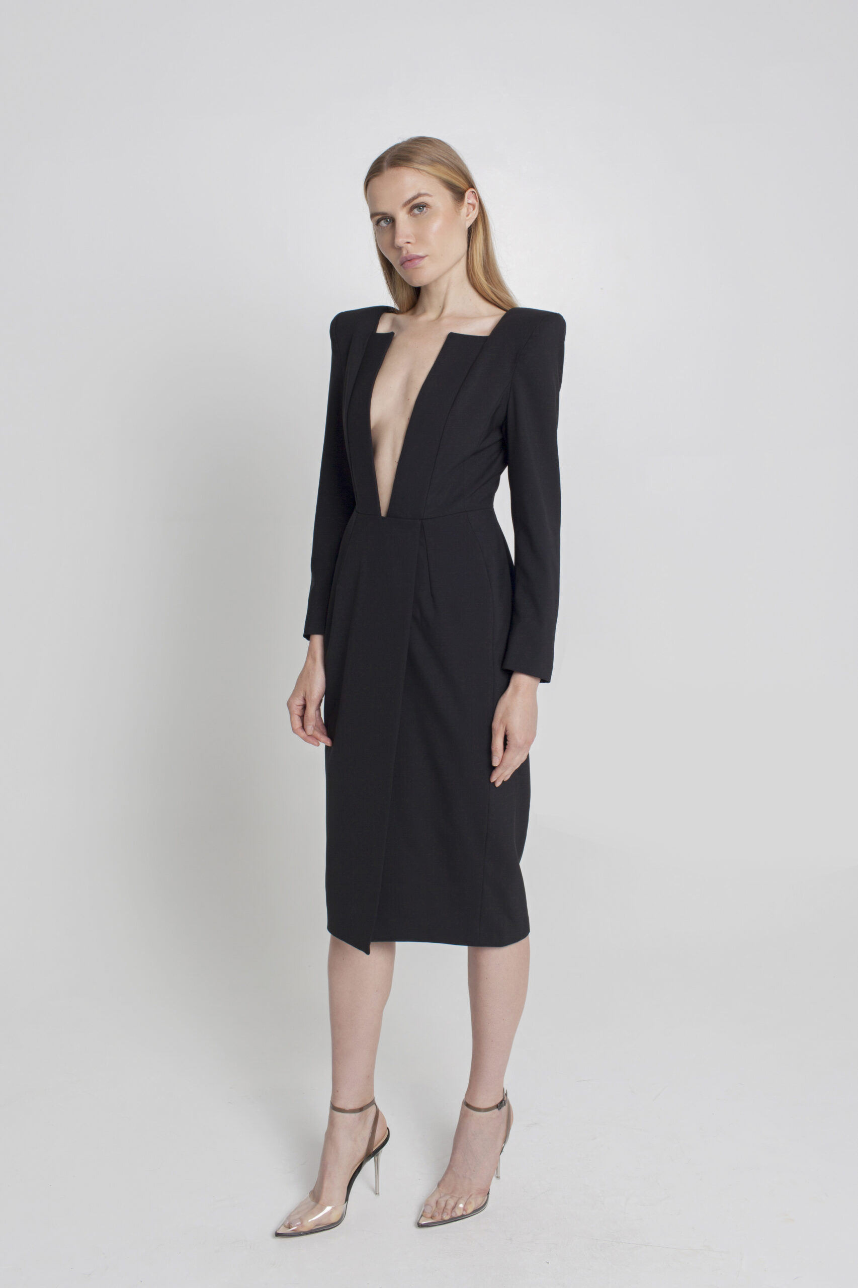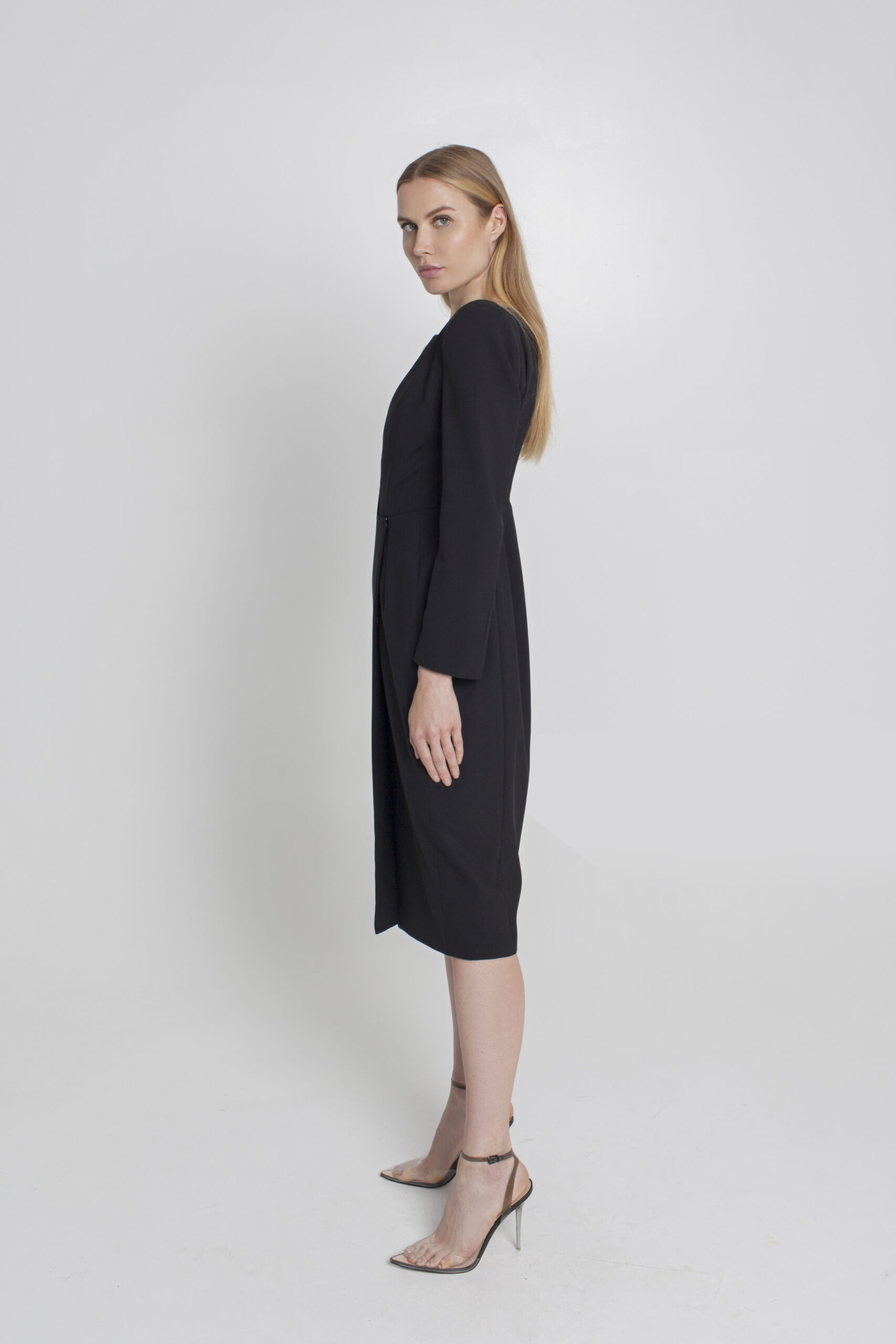 BLACK COOL WOOL DEEP V-NECK, LONG-SLEEVED JACKET/MIDI DRESS WITH SNAP BUTTON CLOSURES.