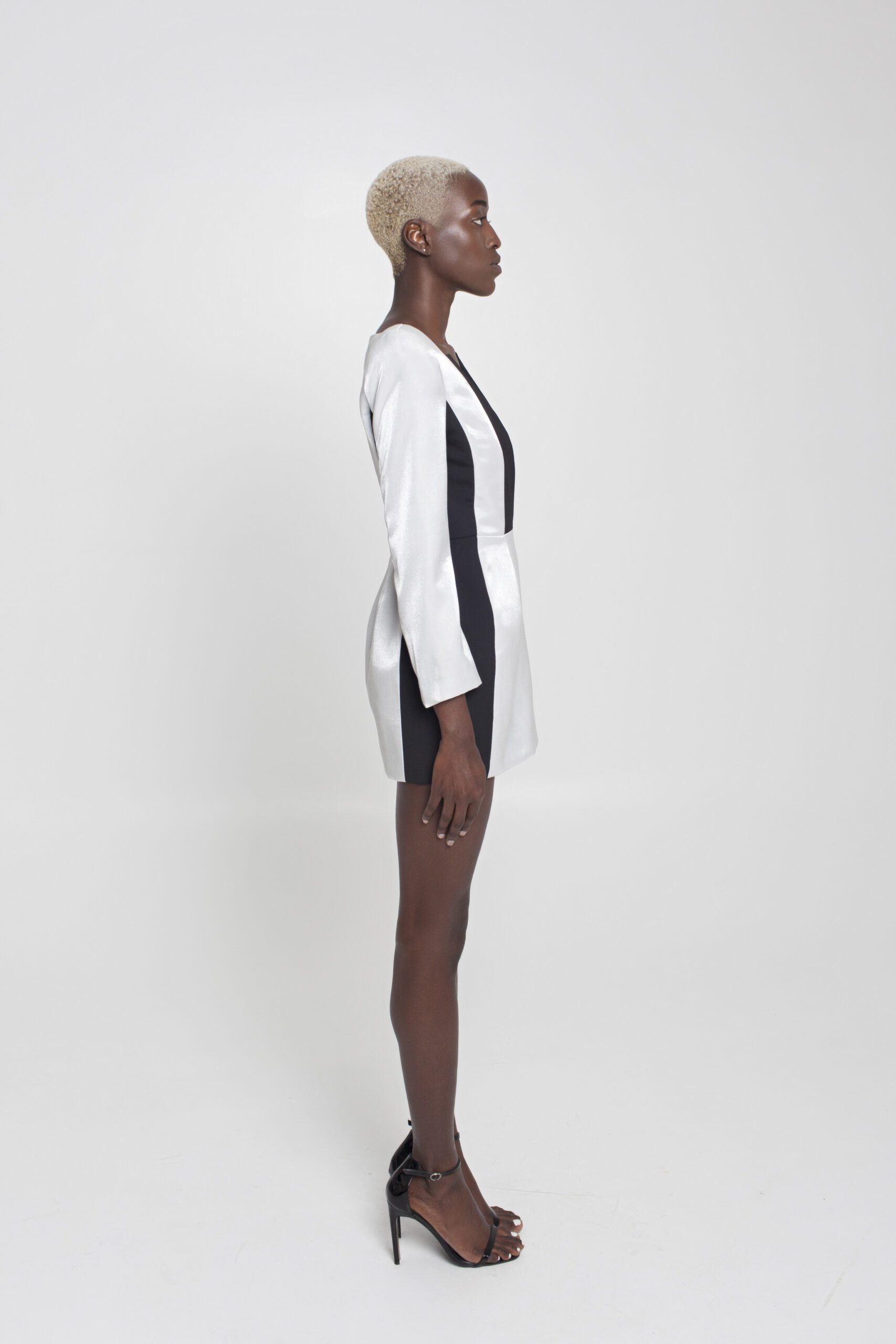 BLACK AND METALLIC WHITE COOL WOOL DEEP V-NECK, LONG-SLEEVED JACKET/MINI DRESS WITH SNAP BUTTON CLOSURES.