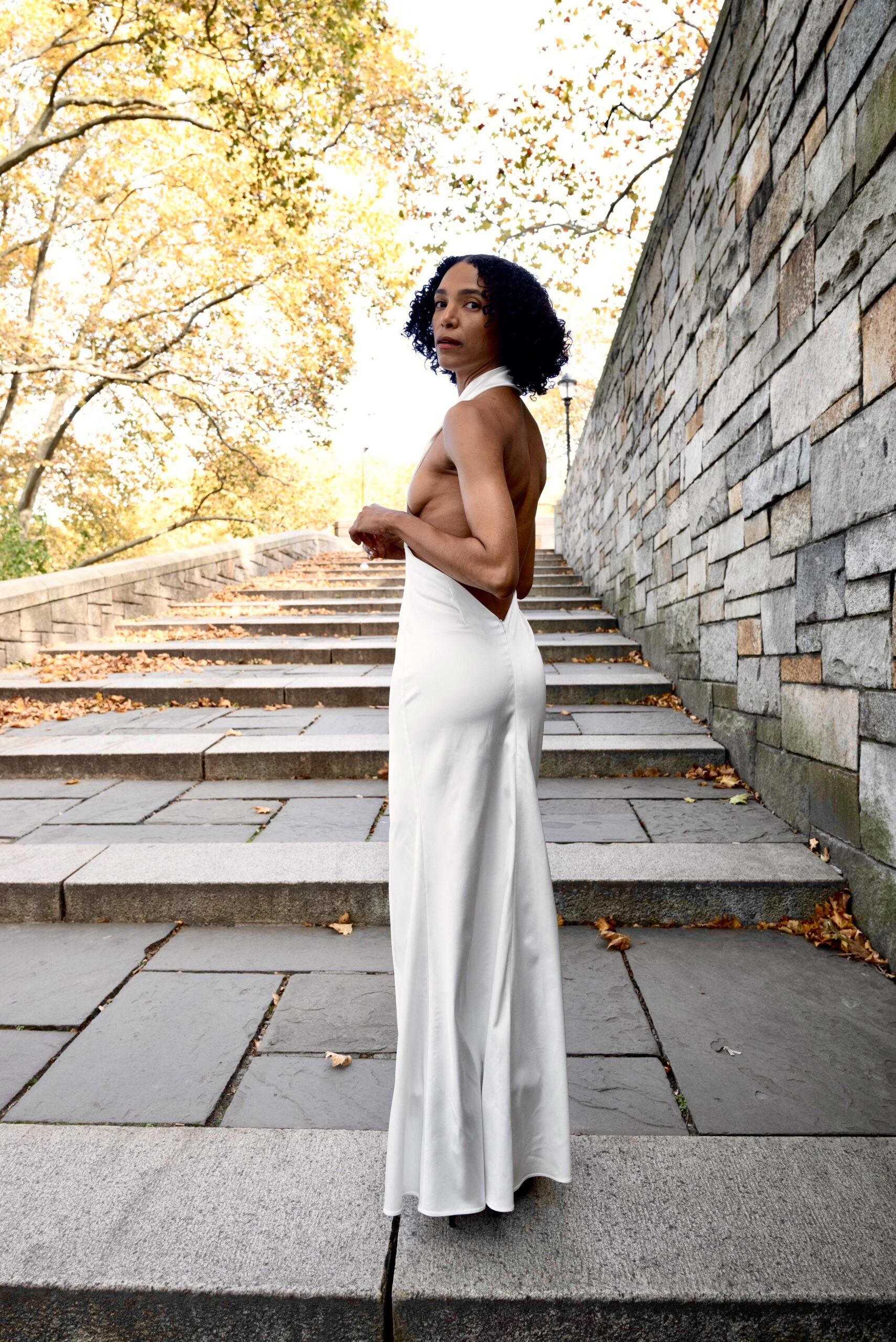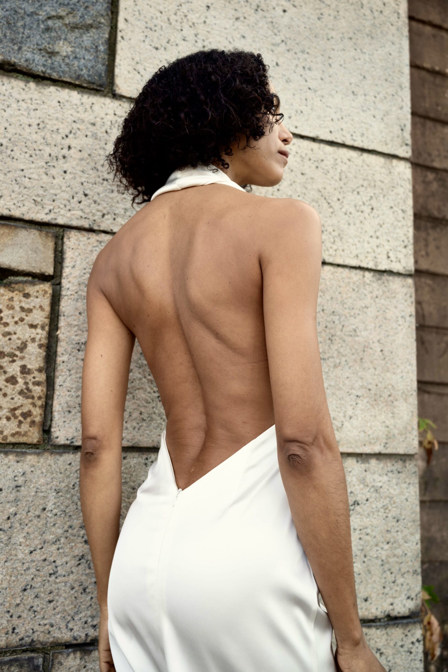 Silk dress with shawl collar and deep V-neckline on the back. Slit on the right side and invisible zip closure.