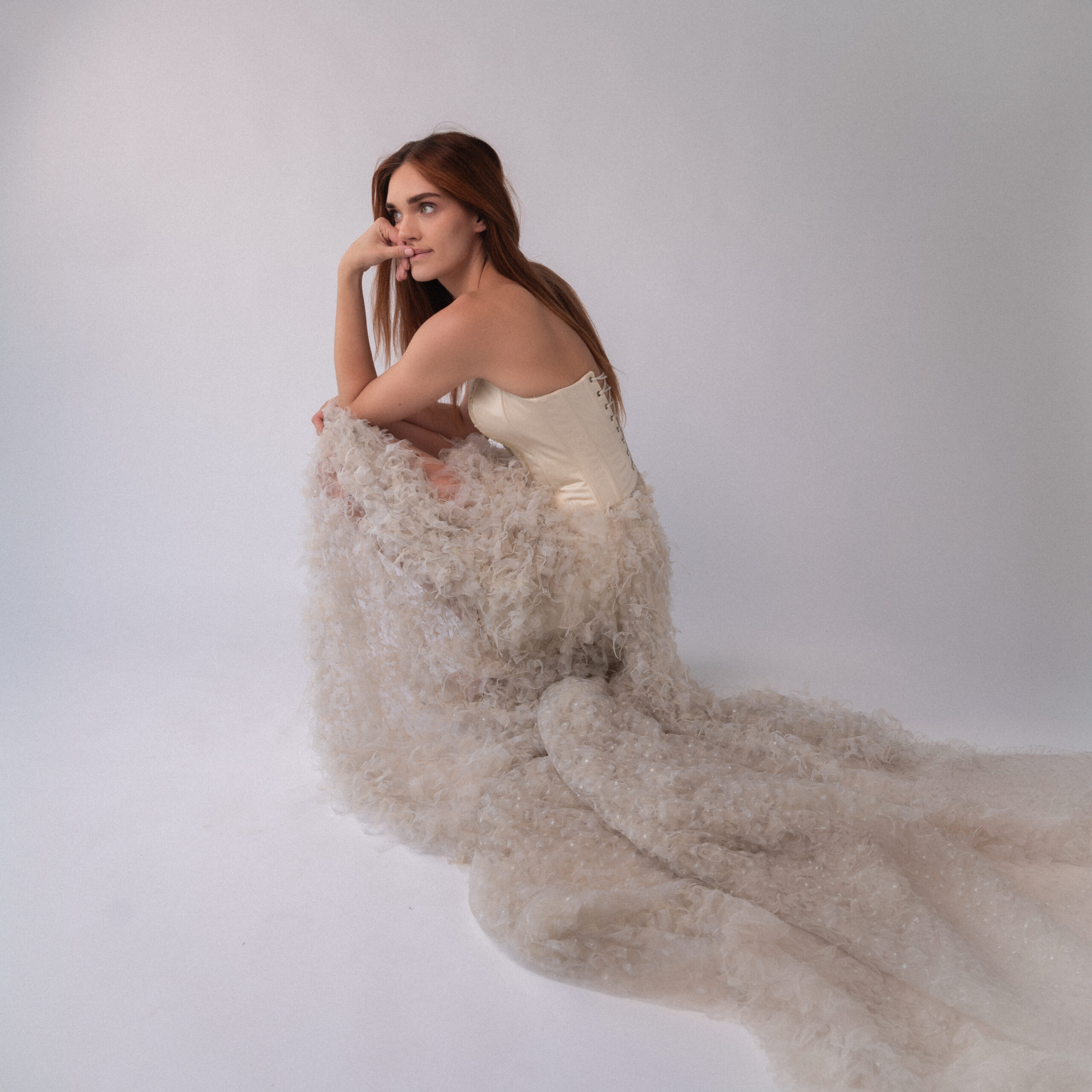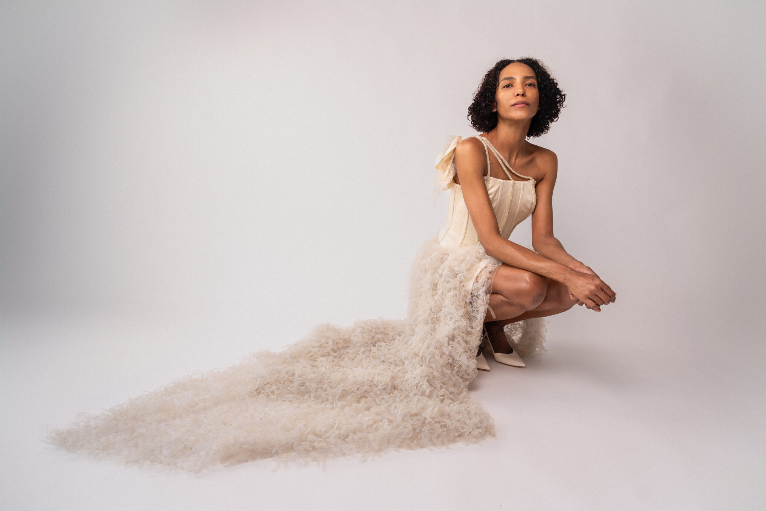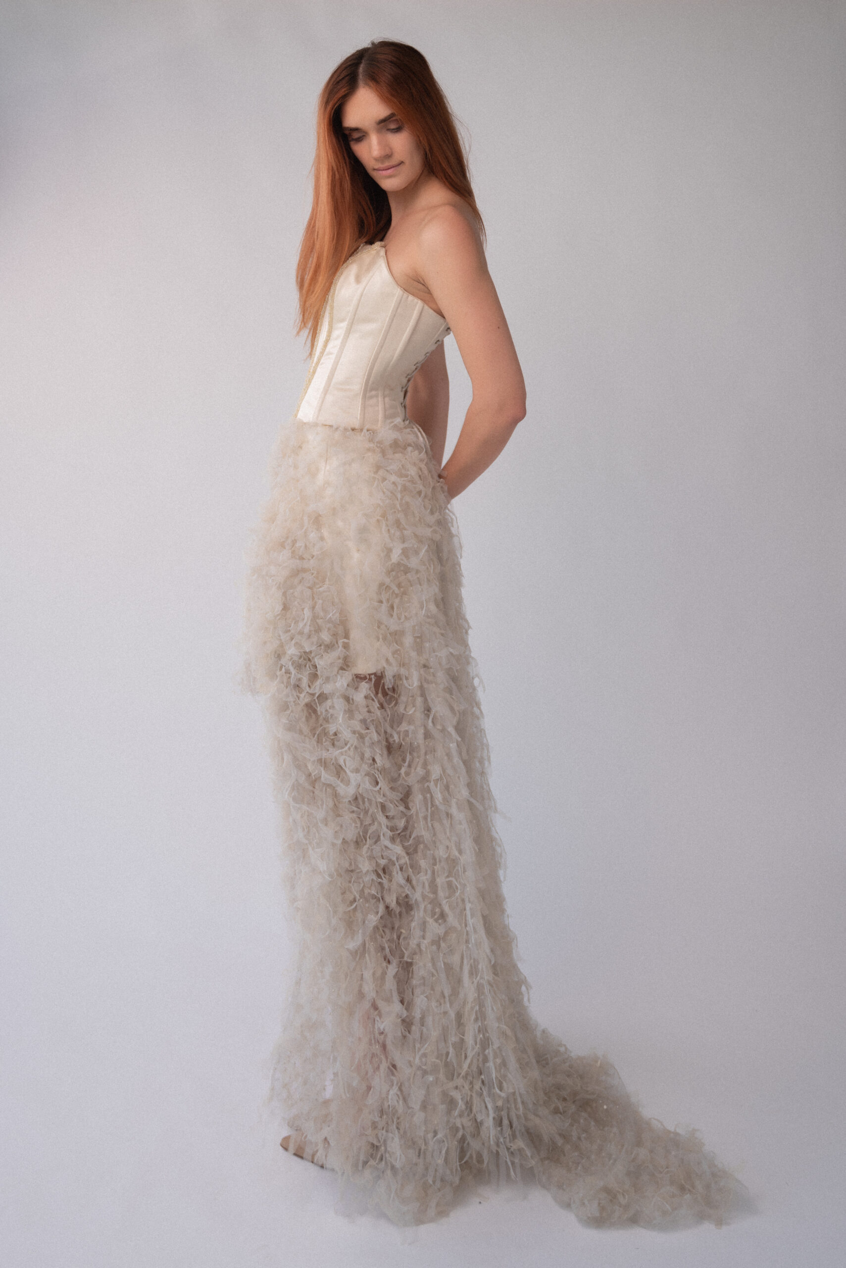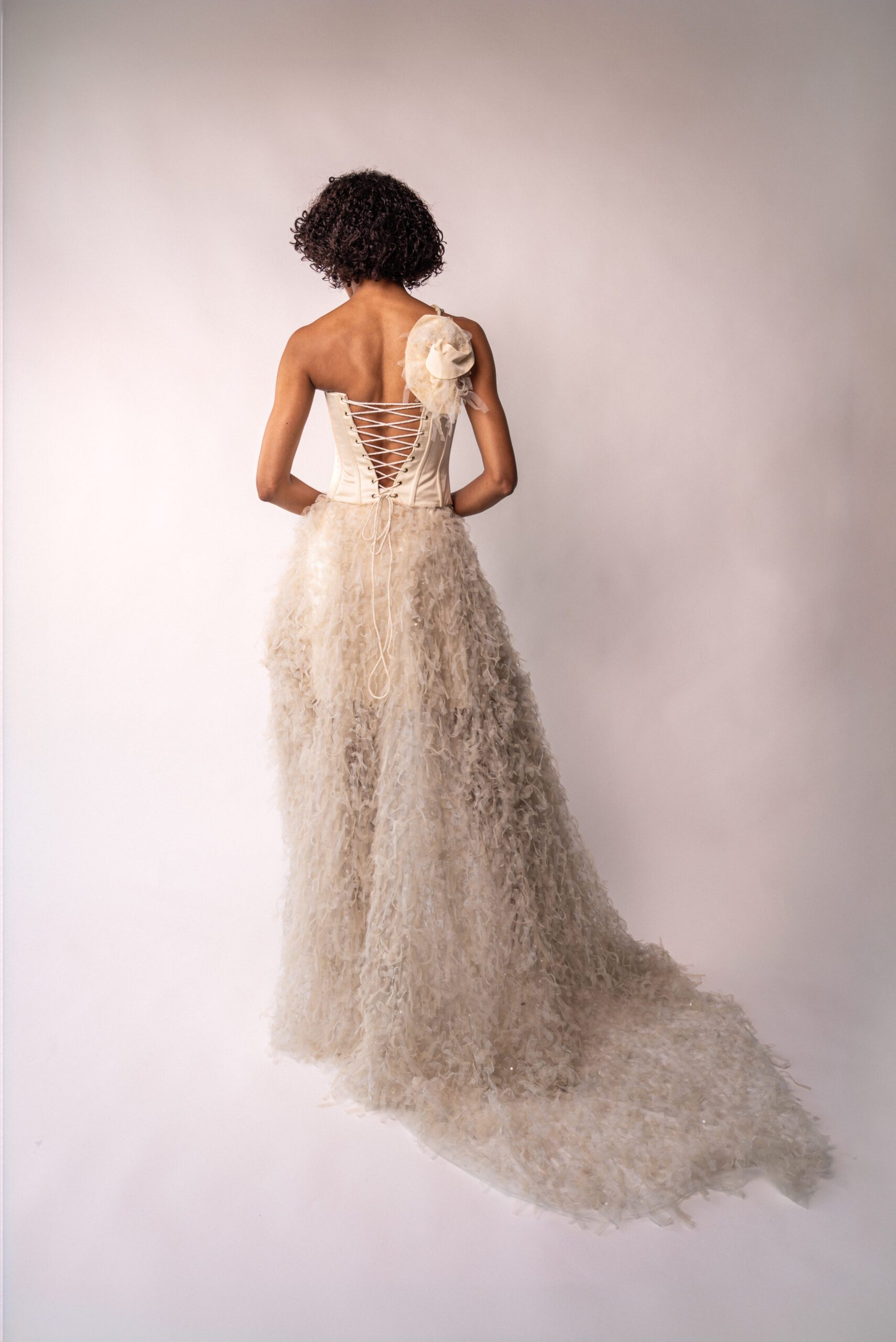 The skirt is a set of many small pieces of tulle that create a feathers effect.